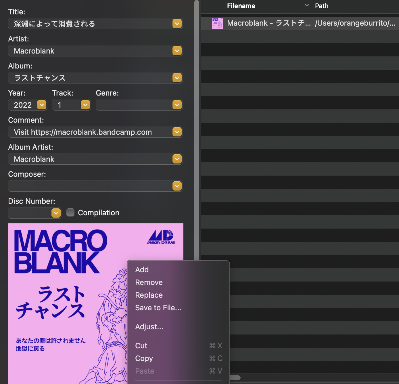 Example of a song and its metadata. Right-click on the album cover to Add or Replace an image